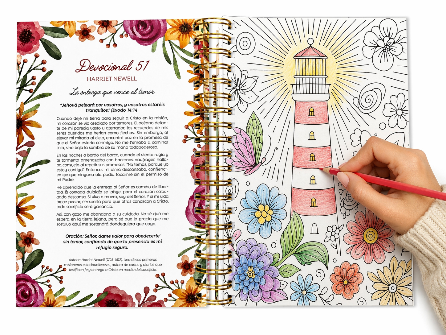 Cada devocional está acompañado de una ilustración para colorear, creando un espacio único donde la reflexión y la creatividad se unen. Mientras das color a cada diseño, encontrarás un momento de paz que te permitirá meditar profundamente en la Palabra de Dios y aplicar sus verdades a tu vida diaria.