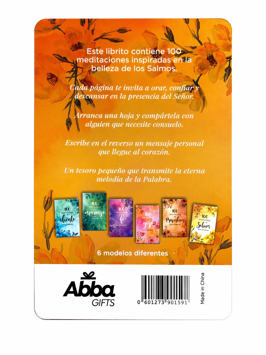 100 meditaciones de los Salmos para compartir Encuentra descanso, consuelo y renovación en la presencia de Dios. Este hermoso block devocional reúne 100 meditaciones clásicas basadas en los Salmos, pensadas para acompañarte en cada etapa de la vida y fortalecer tu fe con palabras llenas de verdad y esperanza.