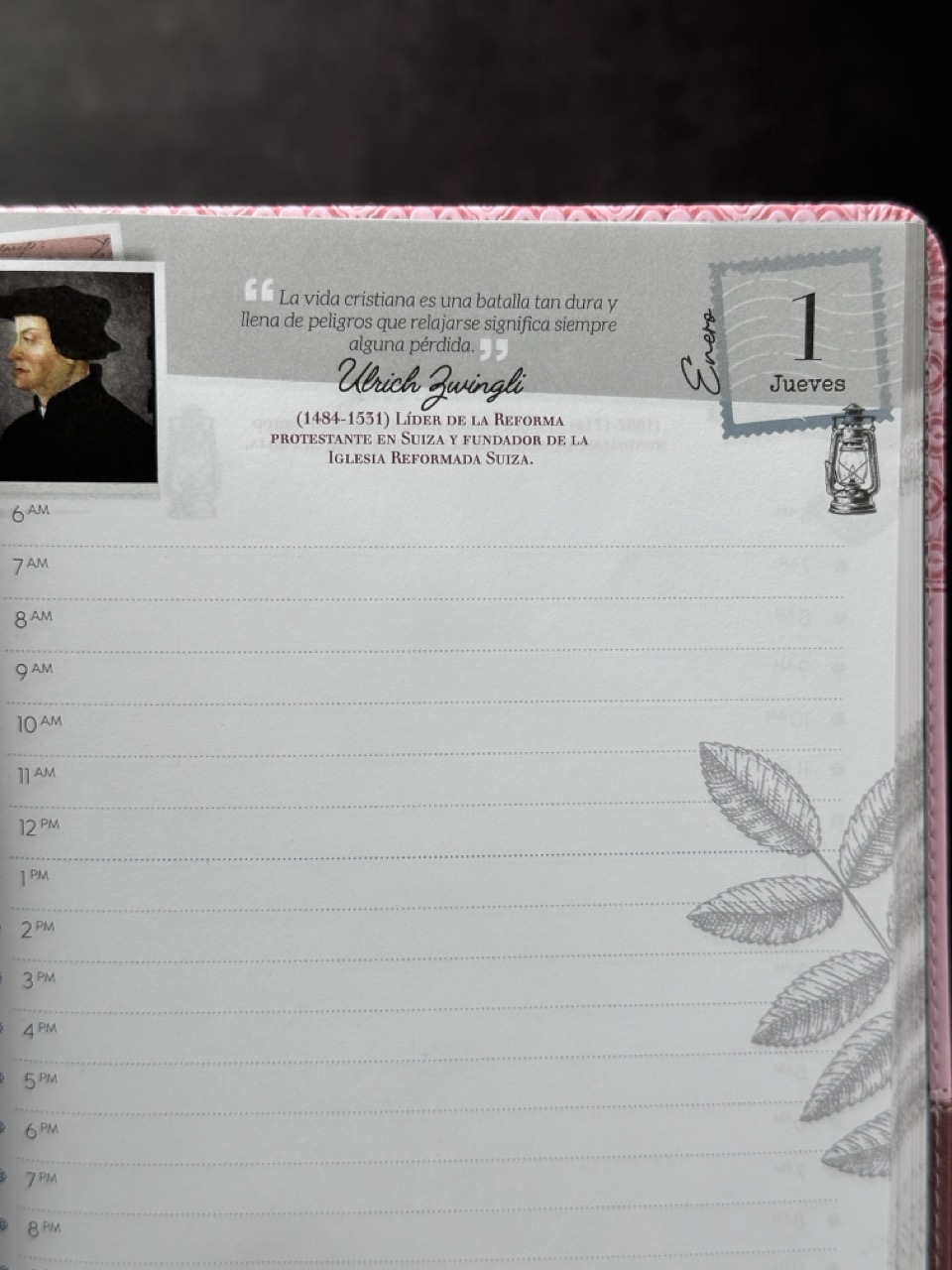 Esta agenda está pensada para acercar al público general la riqueza de los autores clásicos, además de ser una agenda única de gran calidad y con una presentación extraordinaria. Cada día podremos leer una pequeña biografía del autor clásico, una frase célebre que escribió, un retrato de cómo era y un texto de las Escrituras acorde con la sentencia que anotó.