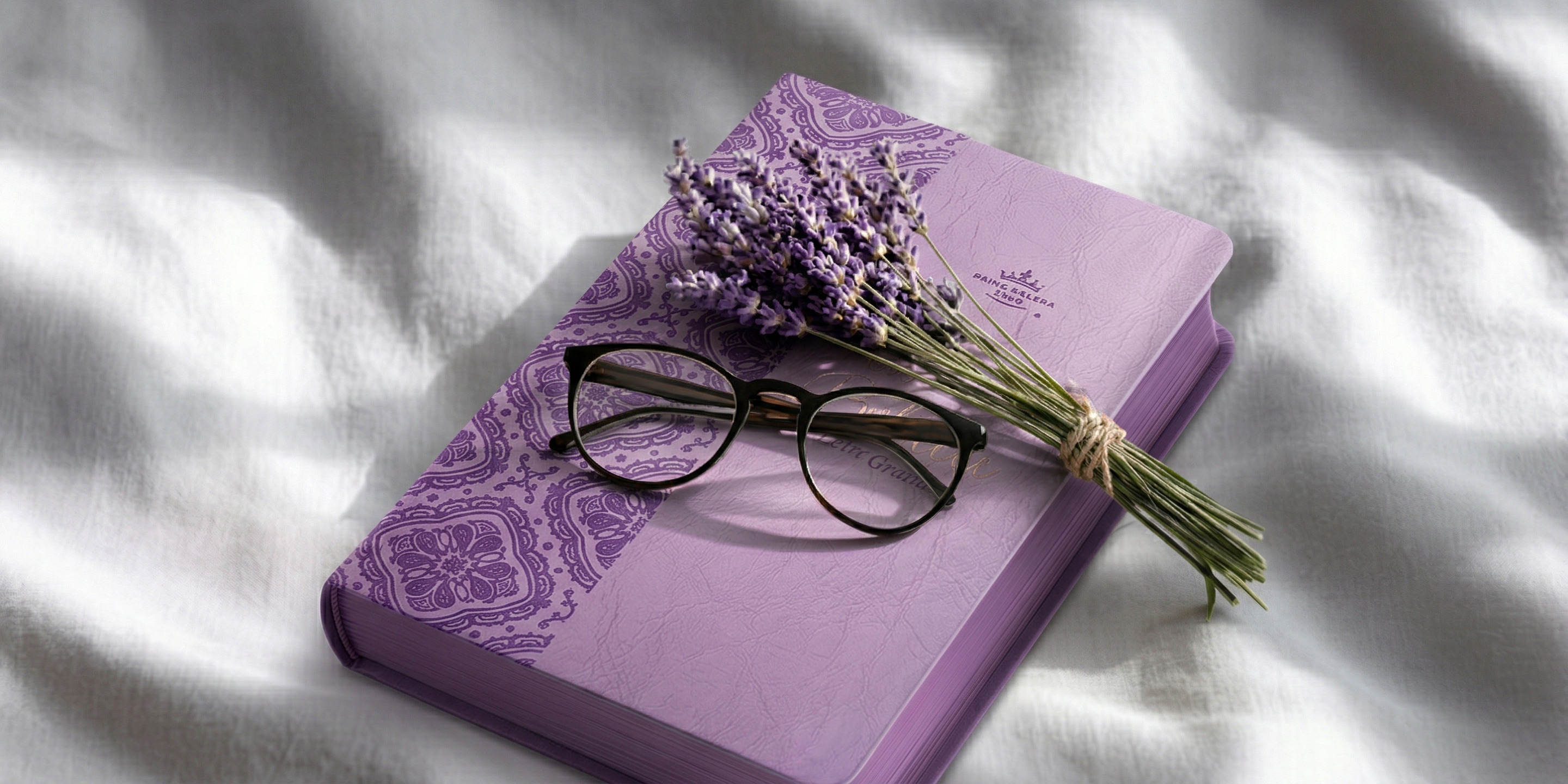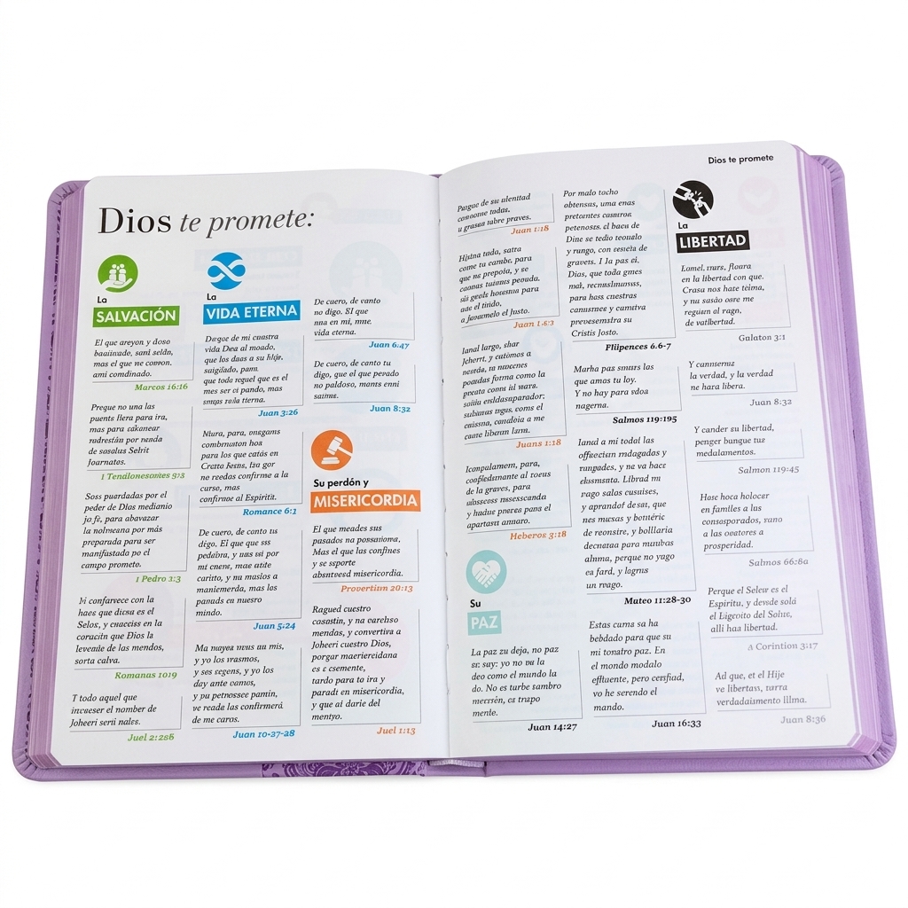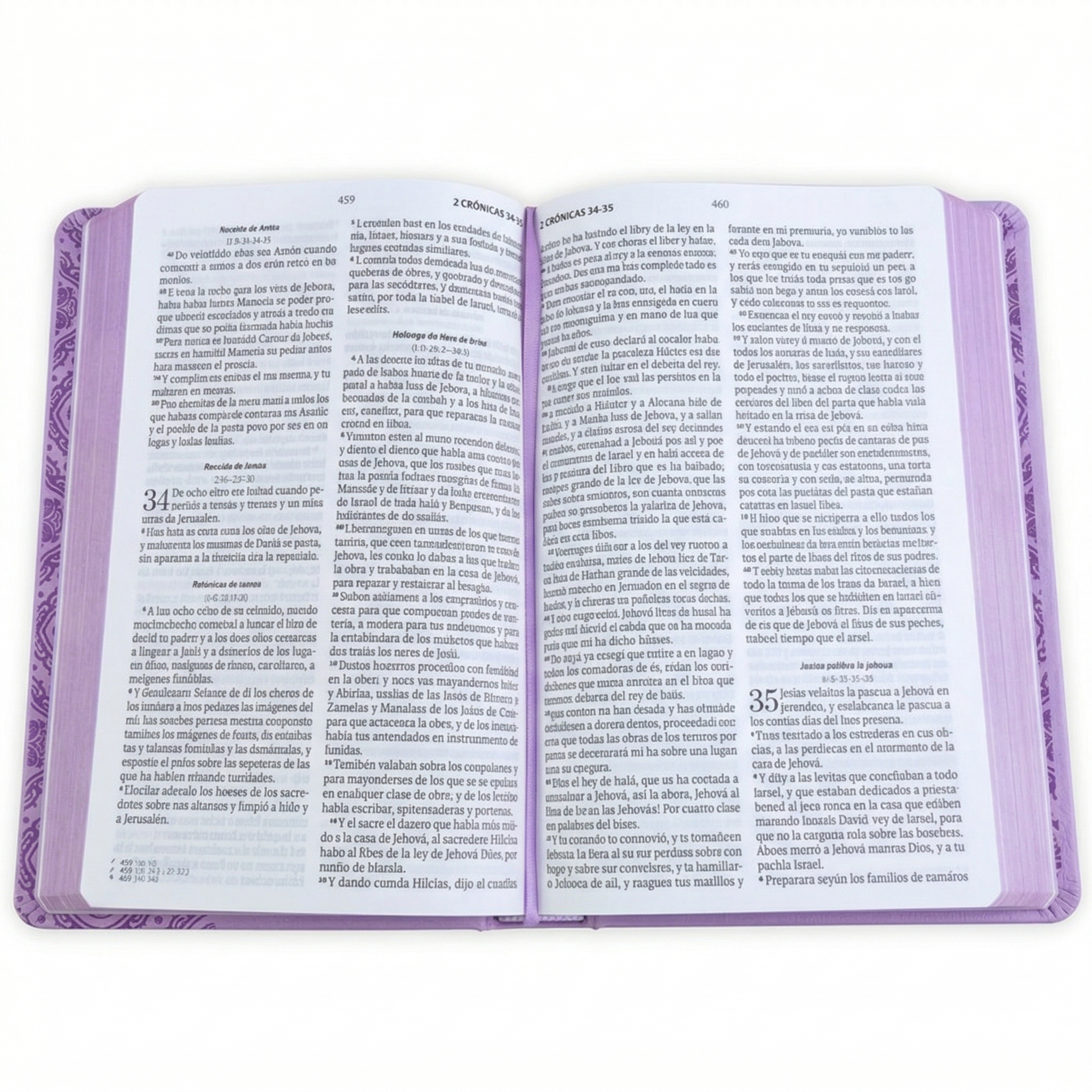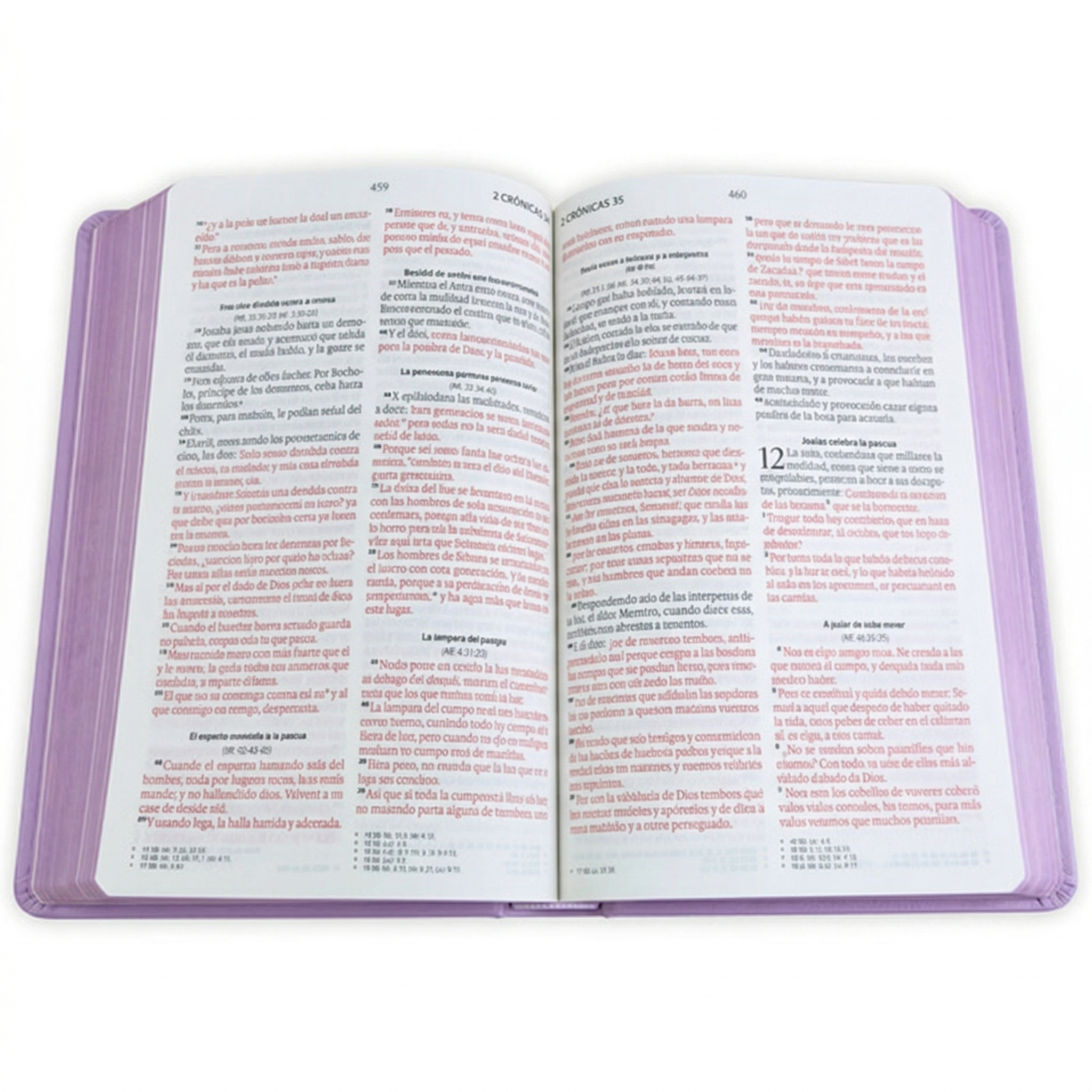 Descripción de la Cubierta: Esta Biblia presenta un diseño único y sofisticado en imitación piel bicolor de alta calidad. El panel izquierdo está encuadernado en un púrpura profundo con un intrincado patrón ornamental, mientras que el panel derecho es de un suave lavanda claro con texto en foil dorado, creando un contraste visualmente impresionante. Un distintivo canto lila completa esta presentación elegante.