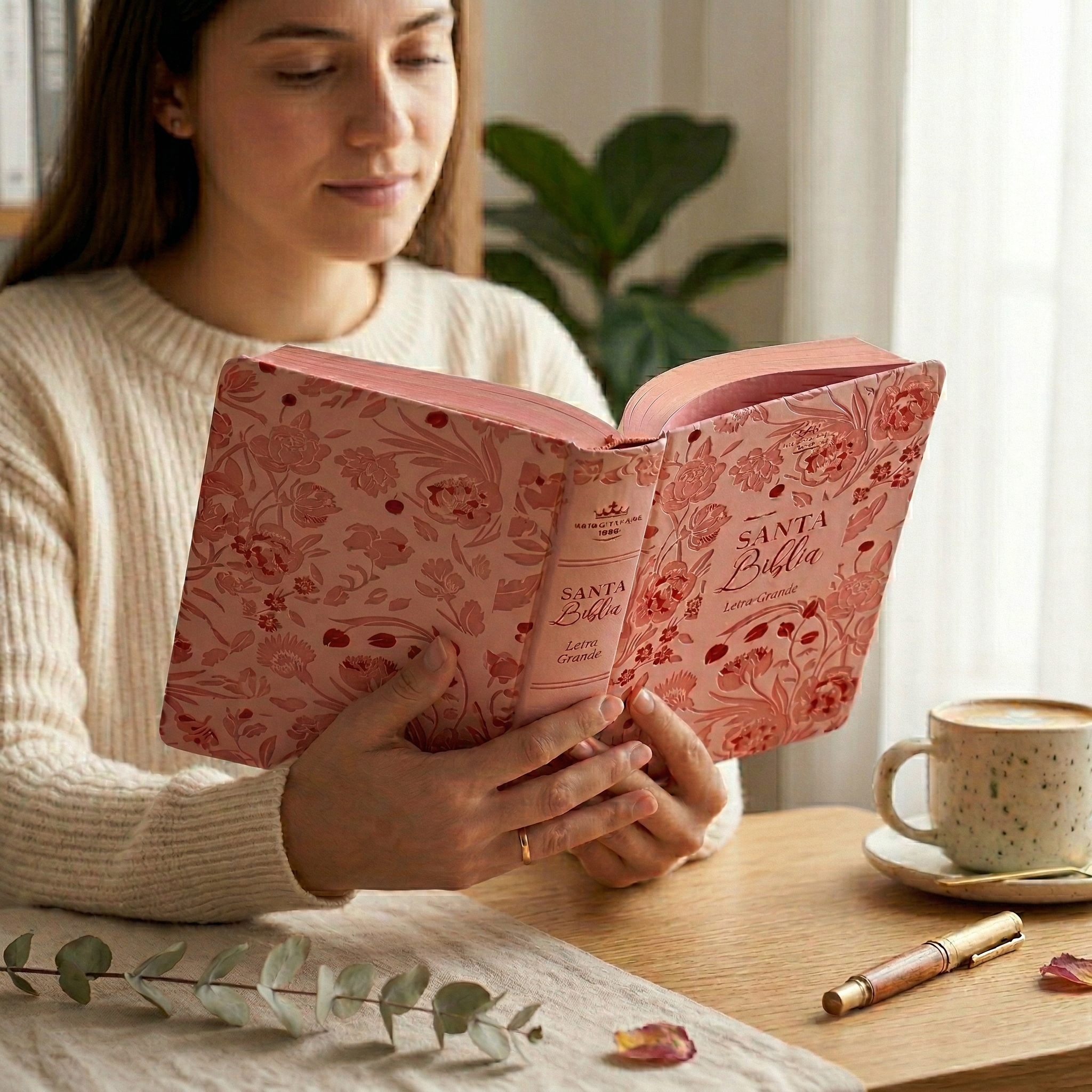 " Diseño Práctico y Femenino: Su tamaño manual (13.8 x 21.2 cm) la hace perfecta para llevar a la iglesia, al café o en tus viajes. La encuadernación en imitación piel y su vibrante canto rosa la convierten en un accesorio de fe hermoso y distintivo.