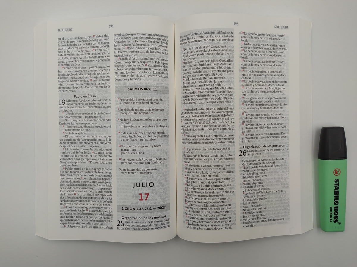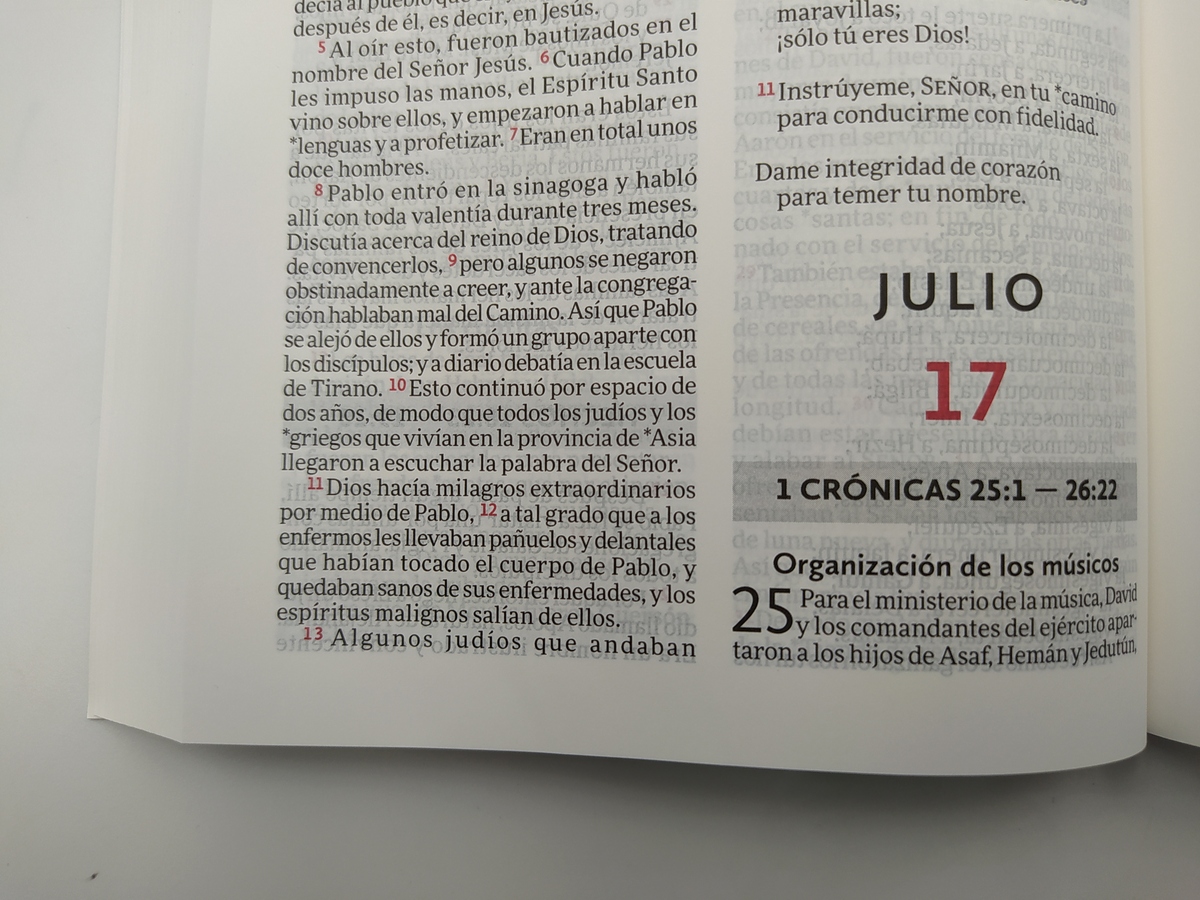 La Biblia para leer en un año en la versión NVI (Nueva Versión Internacional) está formada por lecturas diarias, en donde cada una contiene una porción del Antiguo Testamento, del Nuevo Testamento, de Salmos y de Proverbios. Esta estructura permite que tu lectura sea fresca y emocionante día por día, sin caer en la monotonía. Si bien está agrupada como para que leas toda la Palabra de Dios en un año, también puedes escoger el desafío de leerla dos veces al año o estudiarla más en profundidad leyéndola en dos o hasta en tres años. ¡Puedes diseñar a tu manera la forma de leer tu Biblia!