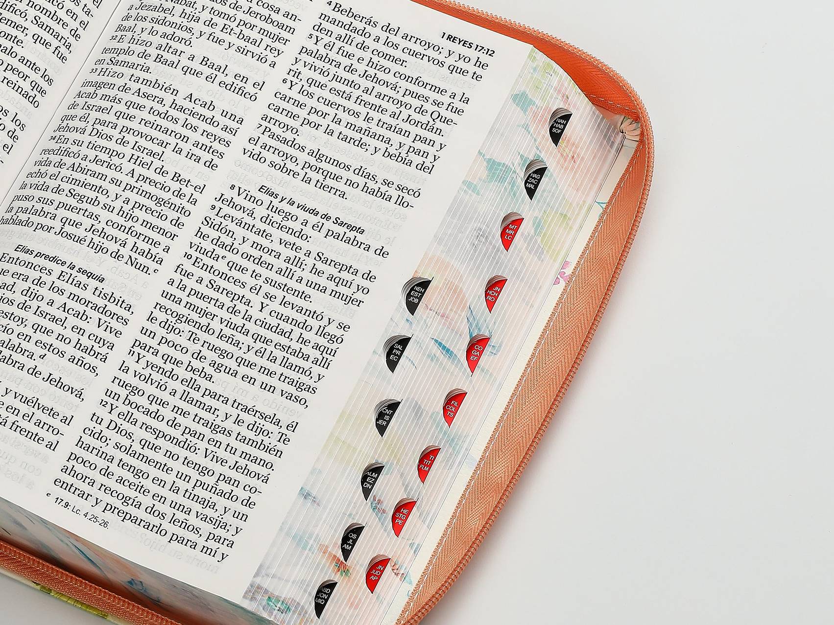 Incluye índice, lo que permite localizar rápidamente cada libro de la Biblia, haciendo más ágil el estudio y la lectura. Las palabras de Jesús en rojo resaltan Sus enseñanzas de manera clara y reverente. Además, cuenta con una concordancia amplia, concordancia de personajes bíblicos, referencias cruzadas y múltiples ayudas, ideales tanto para nuevos creyentes como para quienes desean profundizar en las Escrituras.