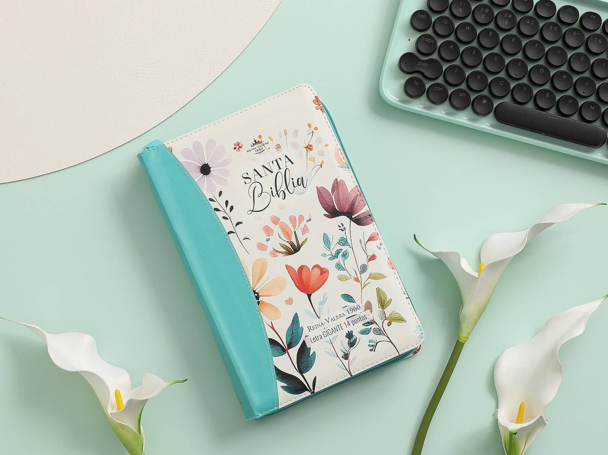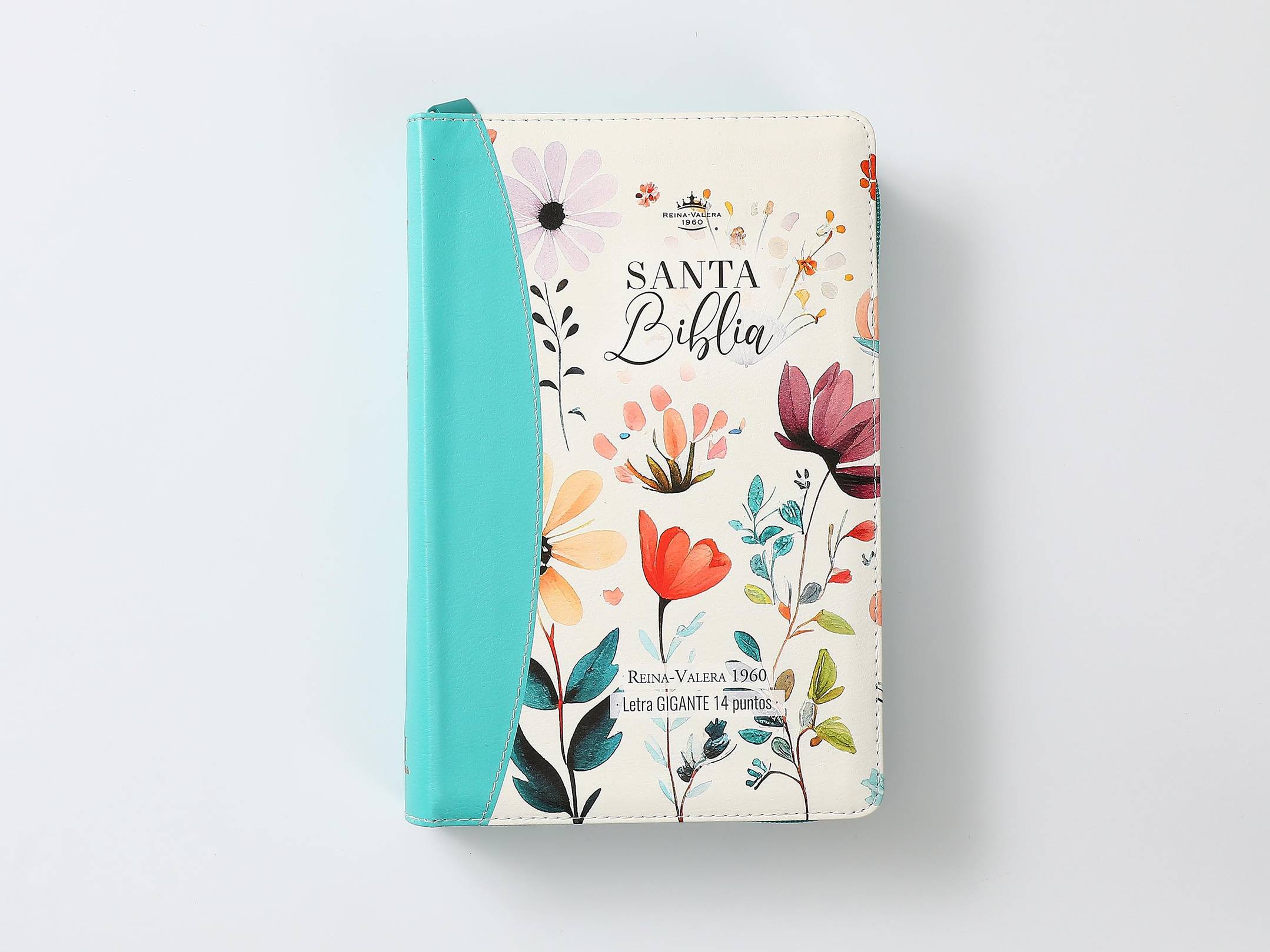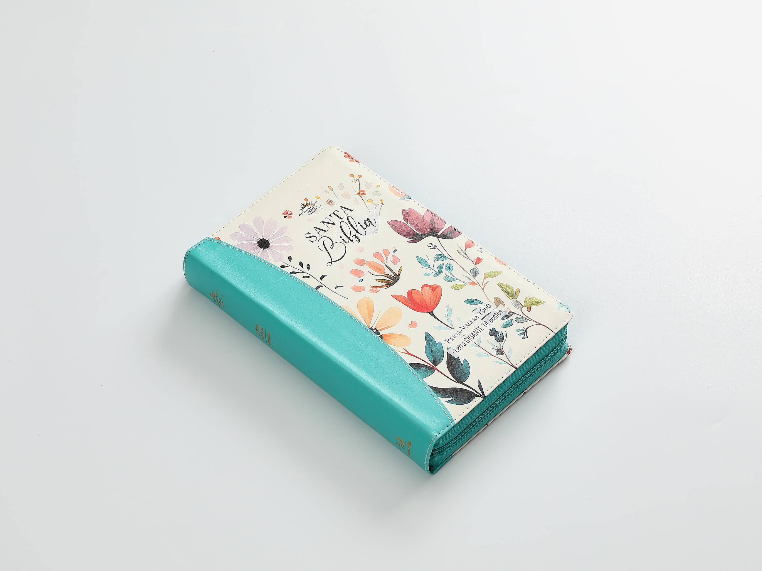 Biblia RVR60 tamaño manual letra Gigante jardín turquesa. Con cierre/índice y canto pintado