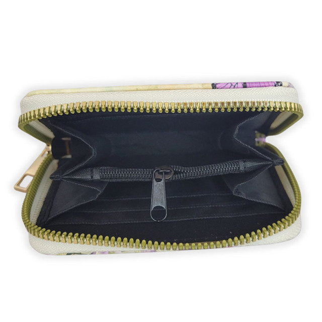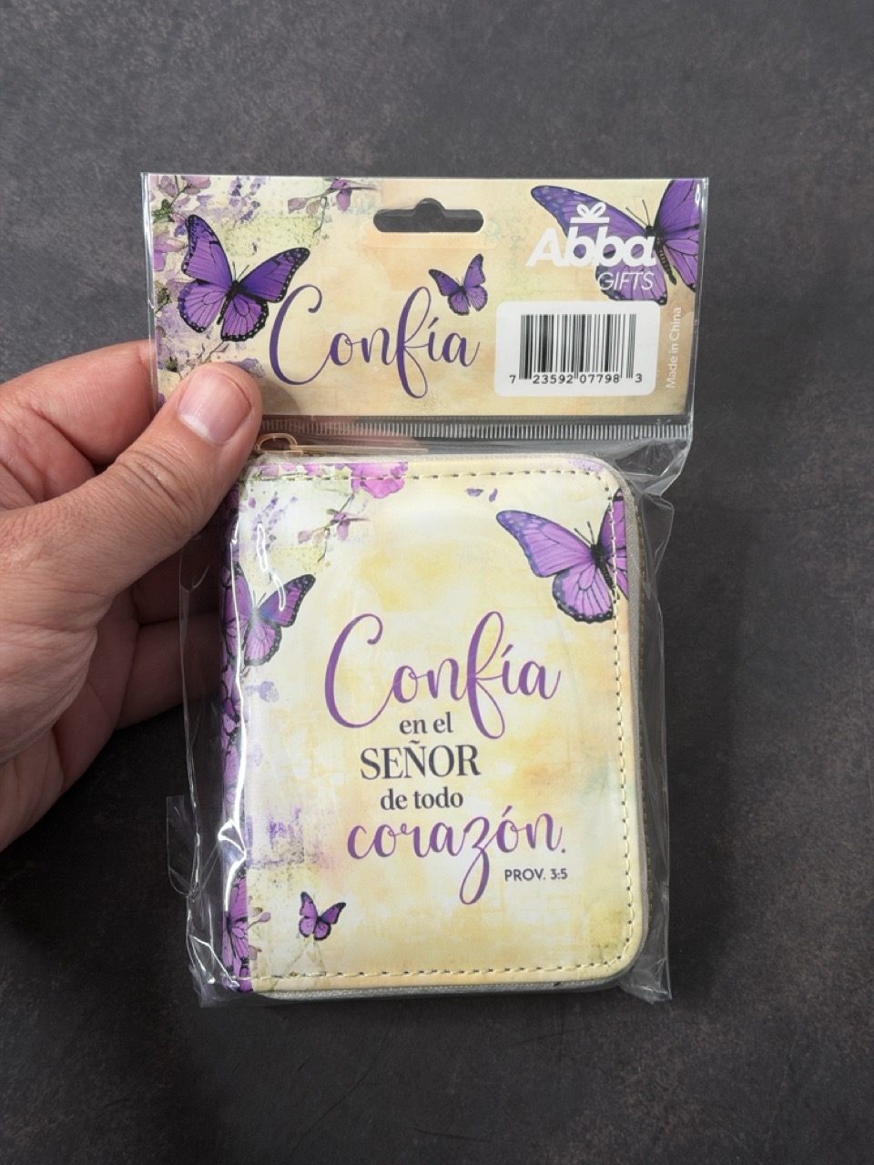 Monedero de imitación piel con compartimentos para monedas y 6 tarjetas. Viene con un versículo y un bello diseño exterior.