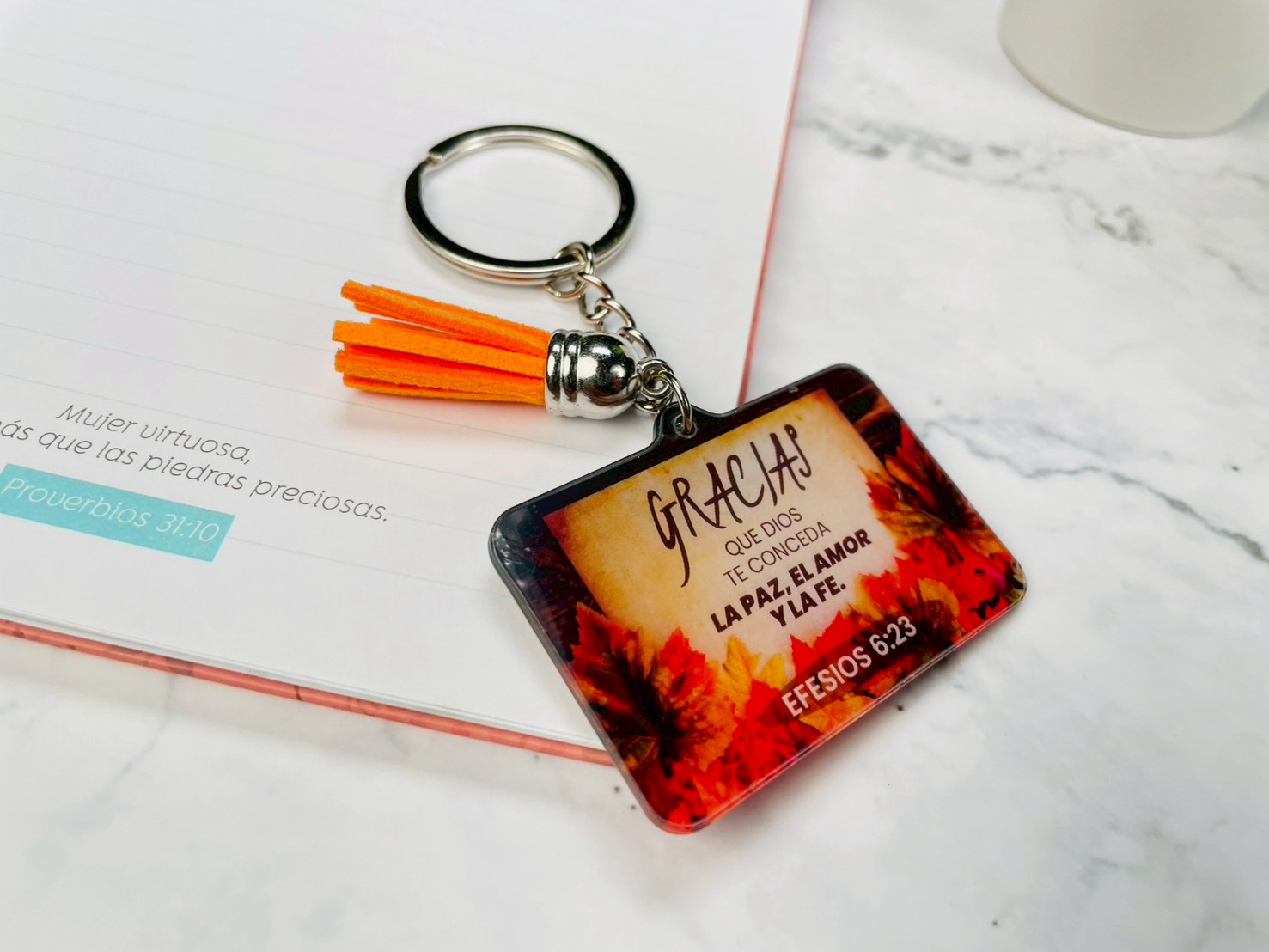 Llaveros acrílicos con versículos bíblicos y pon pon decorativo