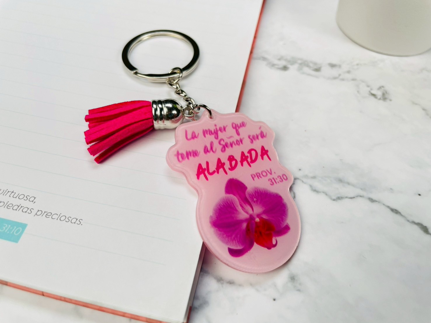 La mujer que teme al Señor - llavero acrílico con pon pon decorativo
