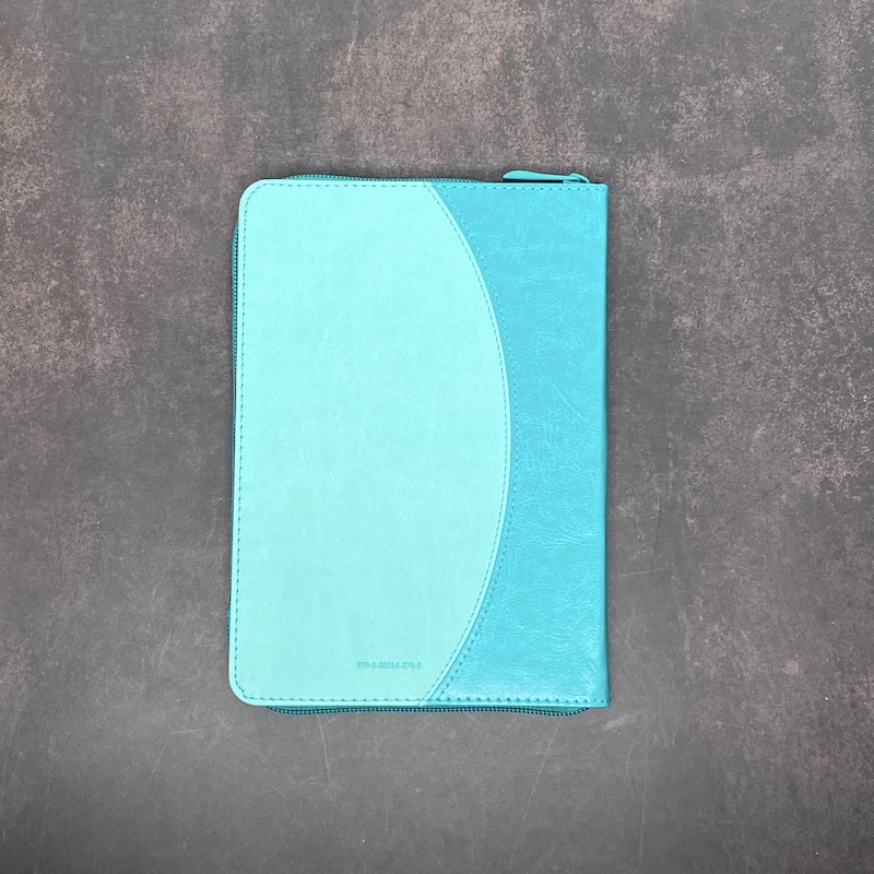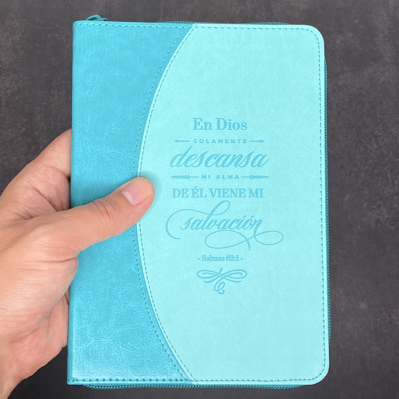 Estas libretas de gran calidad están hechas de imitación piel, tienen cremallera y un versículo bíblico grabado en la portada
