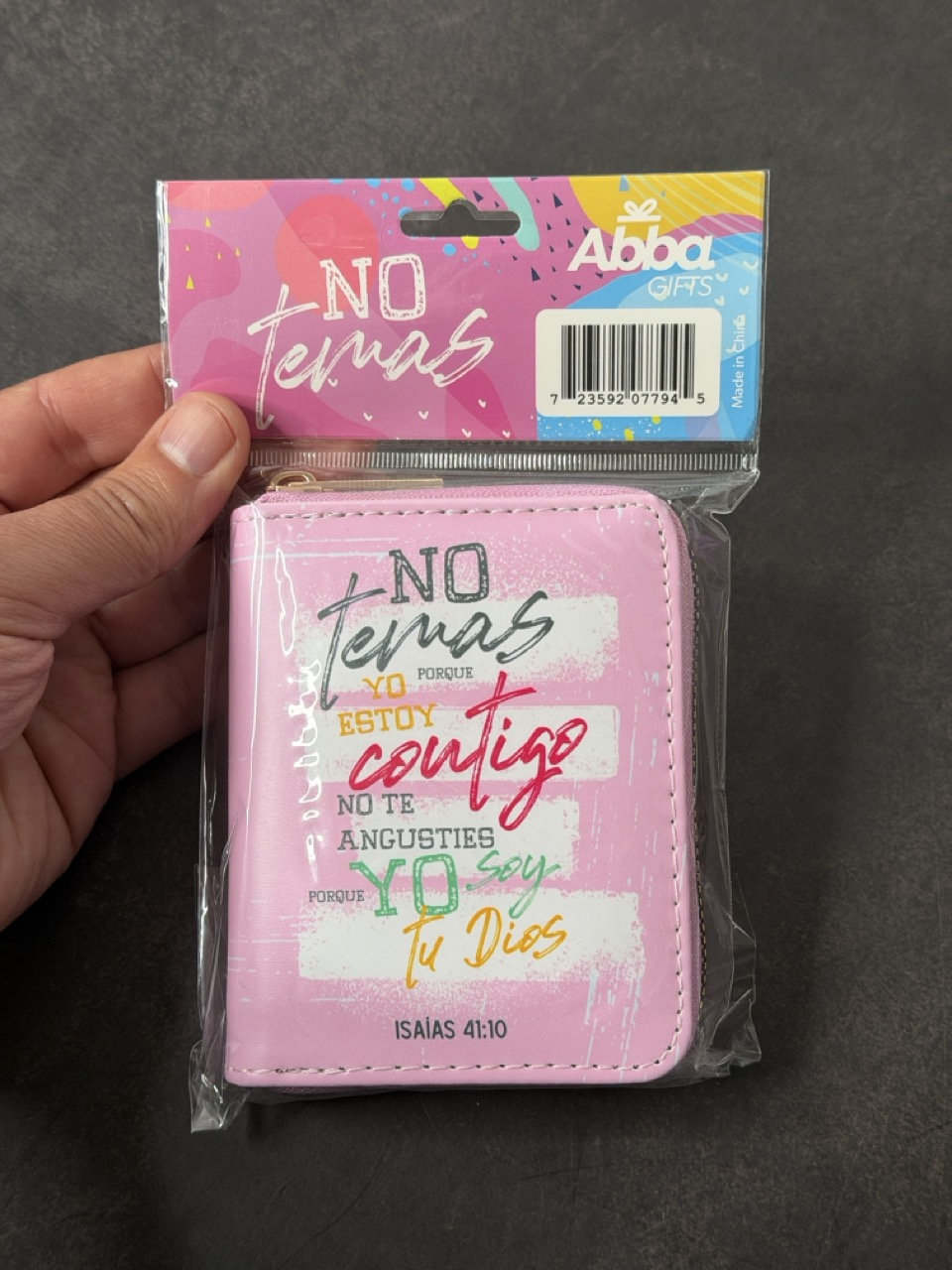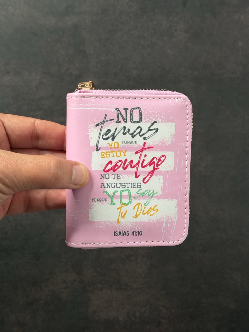 Monedero de imitación piel con compartimentos para monedas y 6 tarjetas. Viene con un versículo y un bello diseño exterior.