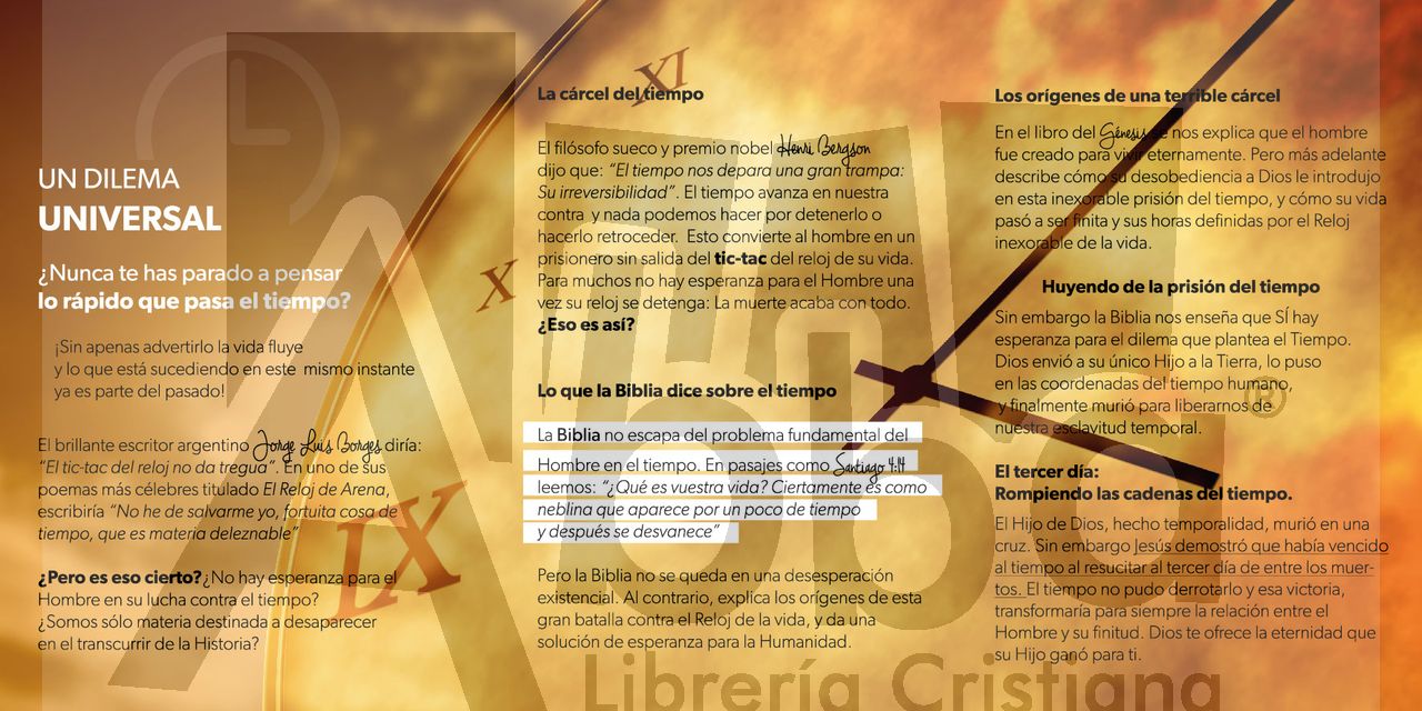 El tiempo es uno de los grandes enigmas de la Humanidad. Por mucho que luchemos por detenerlo jamás podremos lograrlo. La esclavitud del hombre al tiempo ha sido el tema favorito de muchos filósofos. ¿Pero es imposible liberarse de la cárcel del tic-tac del Reloj? Sólo el Hijo de Dios venció al tiempo y nos liberó de su esclavitud.