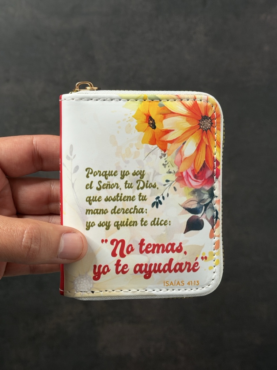 Monedero de imitación piel con compartimentos para monedas y 6 tarjetas. Viene con un versículo y un bello diseño exterior.